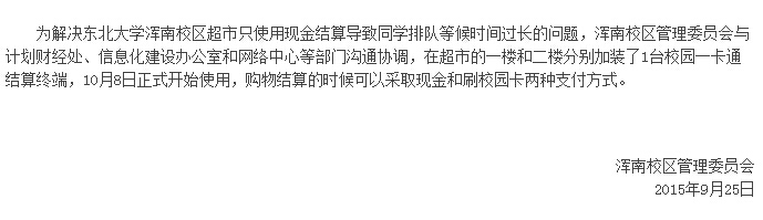 关于浑南校区超市启用校园一卡通结算终端的通知