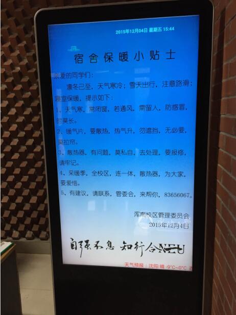 宿舍是同学们在学校的家,也是各类消息通知发布最集中的地方。为了方便通知发布,整合信息资源,倡导电子办公,管委会在每个学生宿舍设置了两台信息发布机。信息发布机既可以发布各类通知、彩色图片、宣传短片,而且实现了网络远程控制,方便管理使用。此项举措,彻底摒弃了过去张贴纸质通知的落后方式,使通知动态化、多样化,也为宿舍增添了新亮点。
