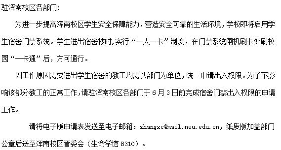 关于东北大学浑南校区学生宿舍门禁系统教工出入权限申请的通知