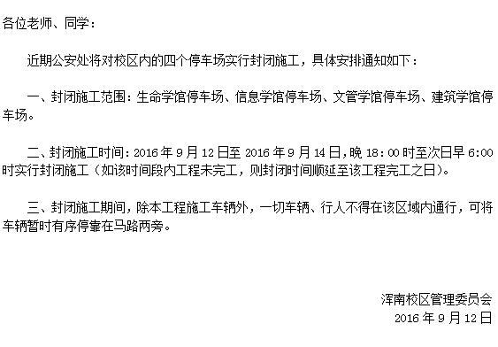 关于浑南校区停车场封闭的通知