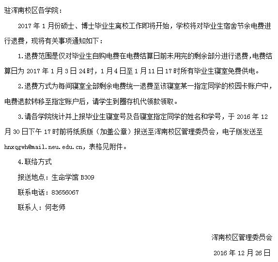 关于硕士、博士毕业生寝室退电费的通知