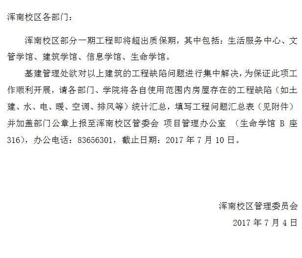 关于浑南校区一期建筑工程缺陷集中上报的通知