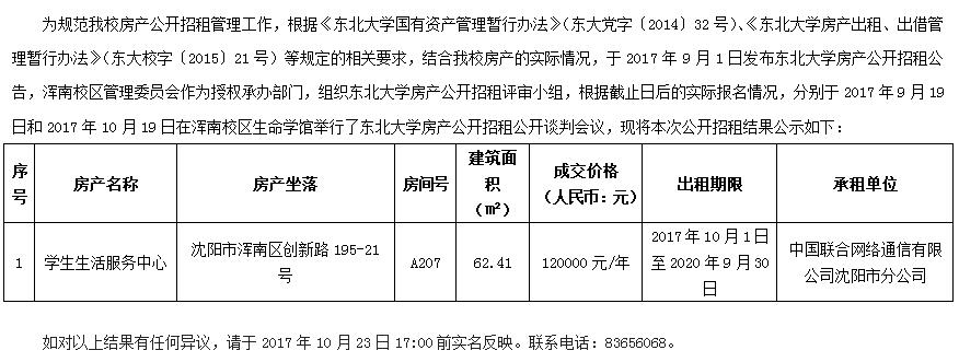 东北大学房产公开招租结果公示20171019