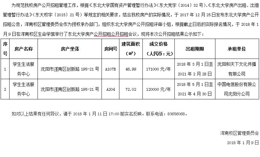 东北大学房产公开招租结果公示20180109
