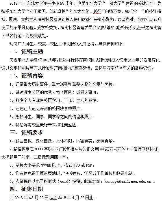 东北大学建校95周年校庆系列丛书(浑南篇)征稿启事