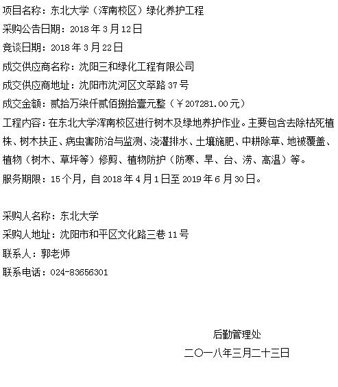 东北大学(浑南校区)绿化养护工程项目采购结果公示
