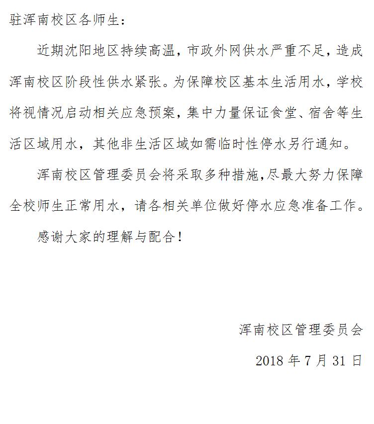 关于浑南校区阶段性供水紧张的通知