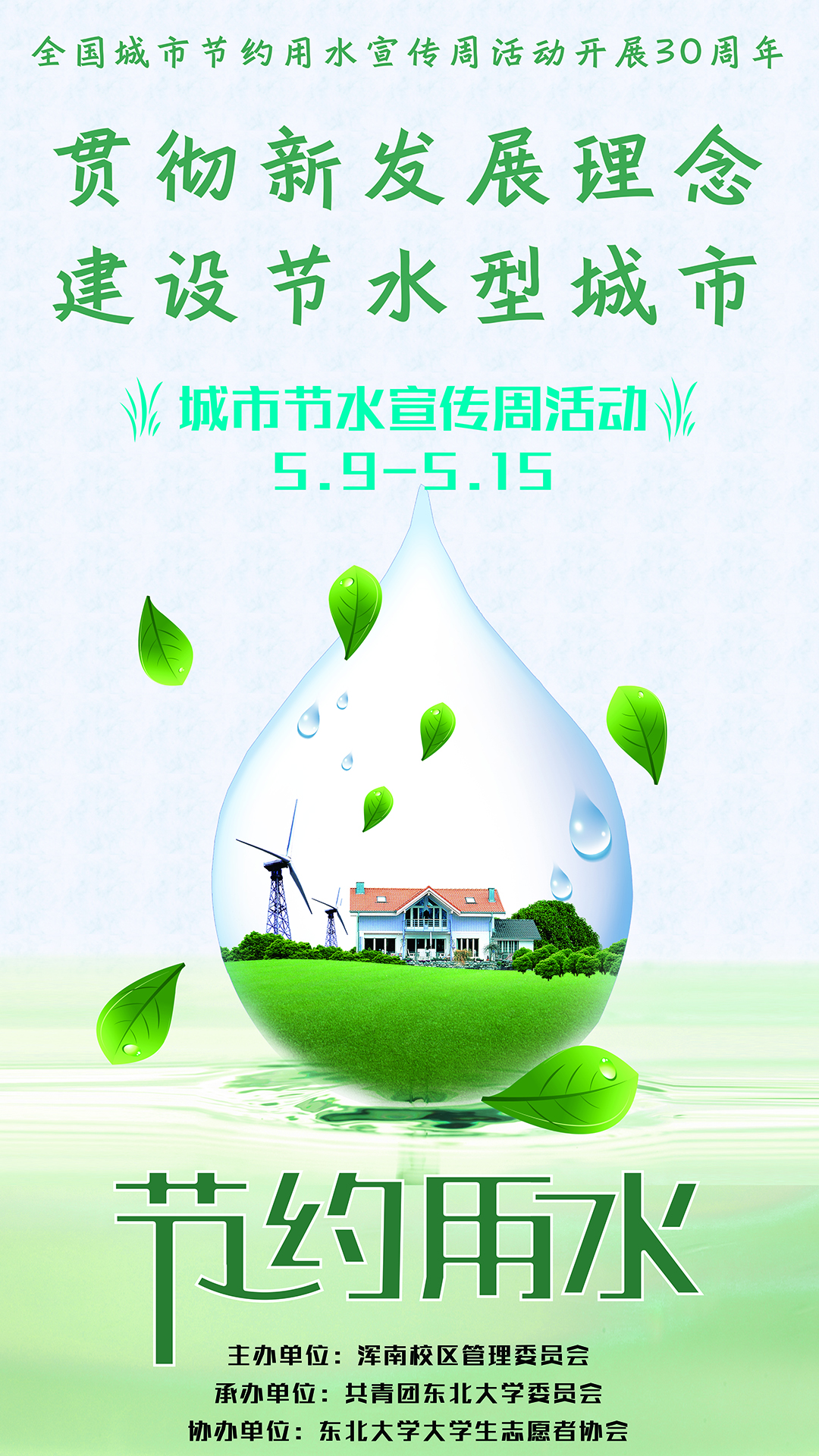 东北大学浑南校区将以此为契机,于本周开展包括节水作品征集、节水知识竞赛、节水妙招倡议、供水实地参观等主题系列活动。敬请各位师生关注,积极参与,共同树立全社会节约用水意识,营造全民节水、惜水、亲水的良好氛围,为经济社会可持续发展贡献自己的一份力量!