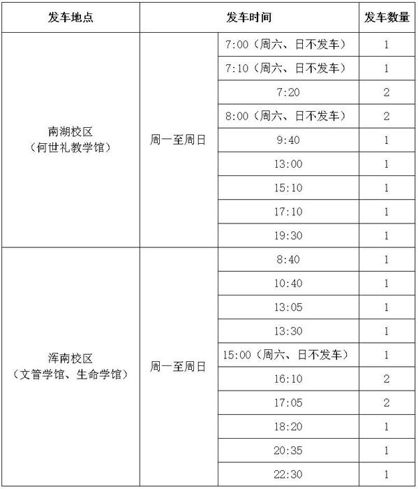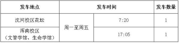 新学期已经开启,自10月3日起浑南校区—南湖校区、沈河校区教职工班车恢复正常运行。为了您的出行安全,特别提醒您乘车时佩戴好安全带,下车时注意脚下和过往车辆。班车运行安排如下: