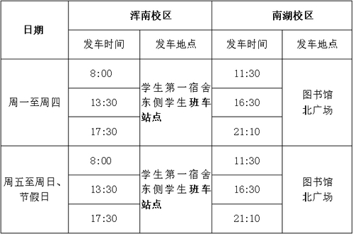 各位同学:根据《关于2024年暑假放假安排的通知》(东大校办字〔2024〕13号)精神,学生放假时间为 7 月 20 日(星期六)至 9 月 1 日(星期日),其中,8 月 31 日(星期六)、9 月 1 日(星期日)返校注册,9月 2 日(星期一)正式上课。现将放假期间学生班车运行安排公布如下。浑南校区管理委员会2024年7月16日