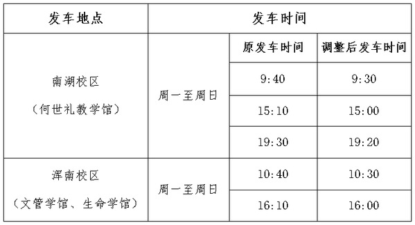 各位老师:根据《关于调整课程时长及教学作息的通知》(东大校字〔2024〕35 号)相关精神,为做好老师教学、科研工作出行保障,提高班车运行效率,结合学校调整后的教学作息时间表,自2024年9月1日起,暂对南湖校区与浑南校区教职工班车部分班次运行时间进行调整。除调整班次外,其他班次运行时间不变。调整班次(暂行)详见下表。请各位老师注意班车运行时间变化,提前做好乘车规划。浑南校区管理委员会2024年8月25日