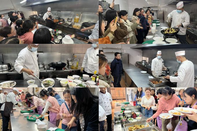 活动现场,厨师师傅通过理论讲解、现场演示、实操教授等环节,详细展示各类家常菜从食材选料、处理加工、烹饪调味、精致摆盘等全套流程。大家“沉浸式”学习了传统家常美食“老式锅包肉”“拔丝三样”“清蒸鲈鱼”“家庭拌菜”“四喜丸子”等菜品的制作,并品鉴佳肴。每一次活动现场都是菜香扑鼻,处处洋溢着欢声笑语。参与活动的教职工向厨师师傅请教烹饪要点,交流美食制作的经验,共同感受厨间烟火带来的放松与快乐。